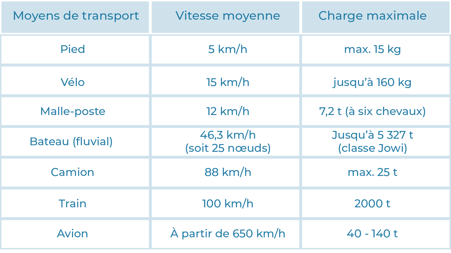 Vitesse moyenne et charge maximale des moyens de transport