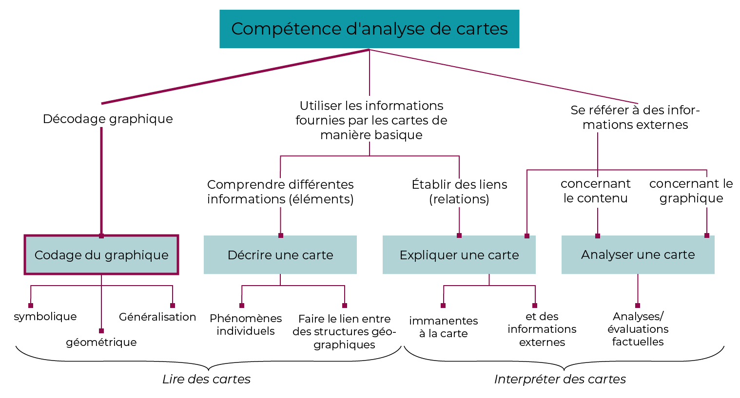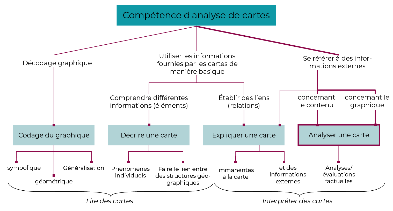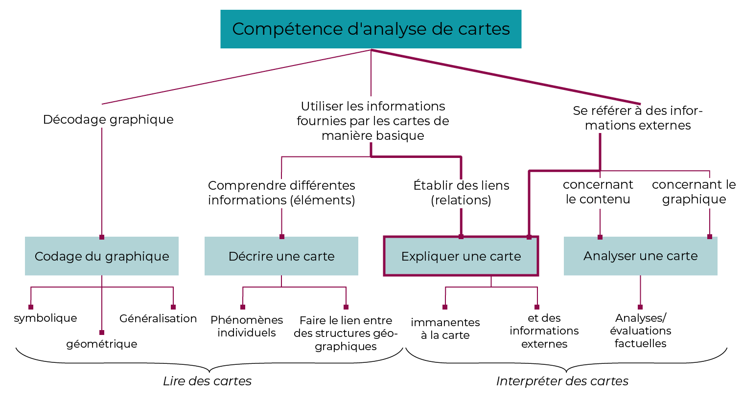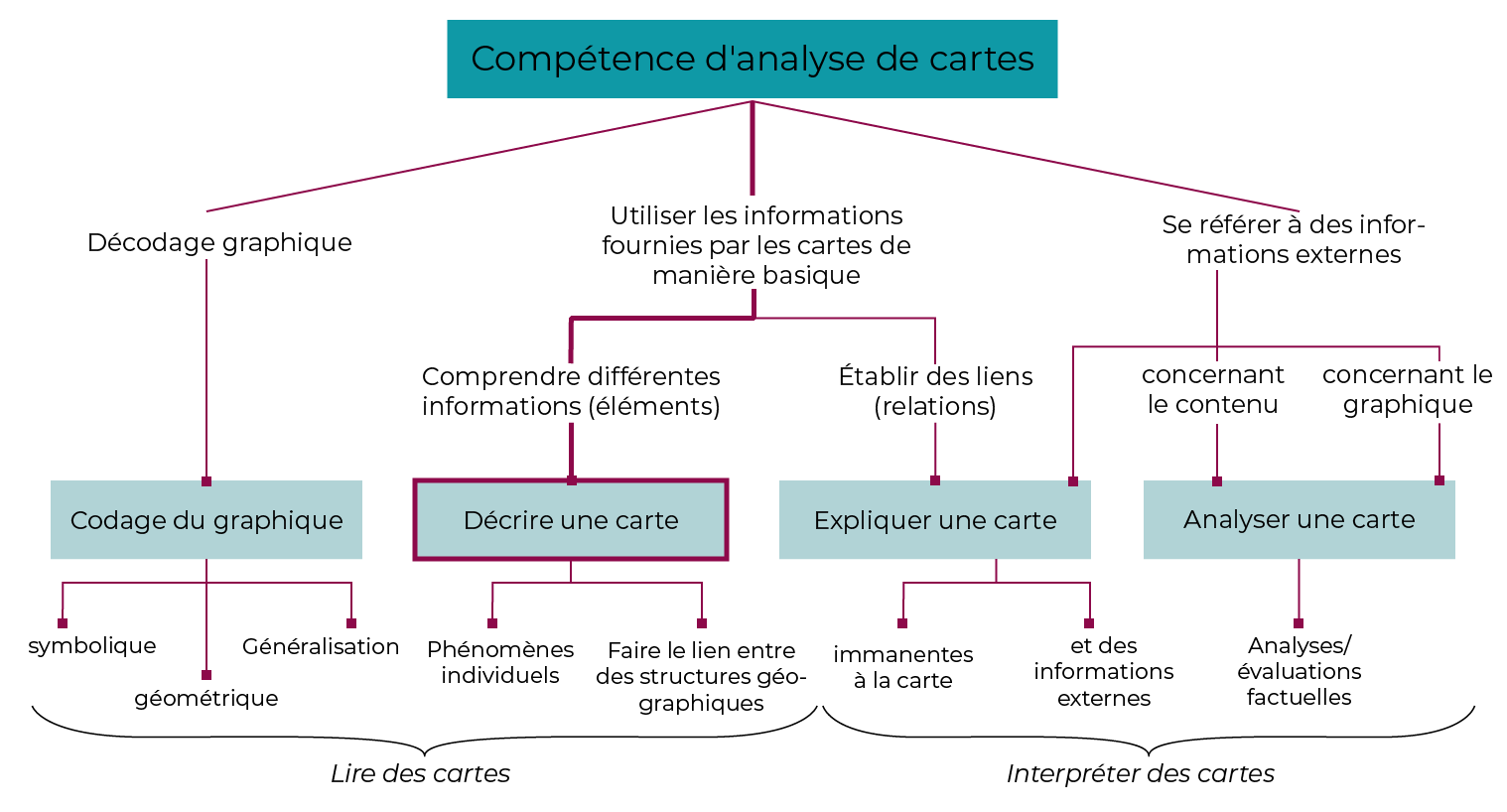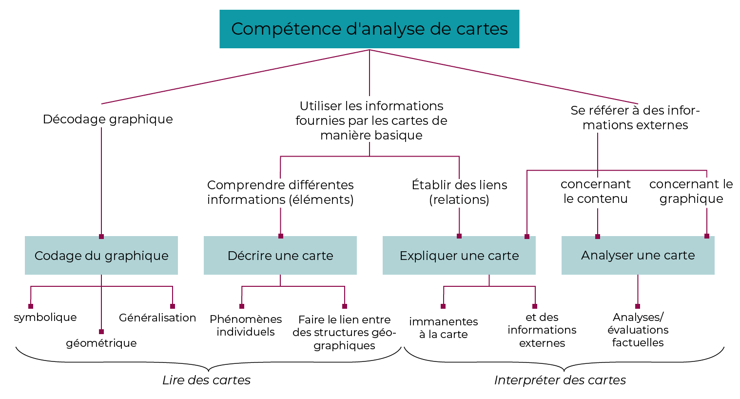 Ce chapitre est axĂ© sur lâacquisition de la compĂ©tence dâanalyse de cartes, qui selon le modĂšle de Ludwigsburg sur lâanalyse des cartes, est subdivisĂ©e en diffĂ©rents domaines de compĂ©tence (voir graphique). L'Ă©tude approfondie et mĂ©thodique des cartes permet Ă©galement aux Ă©lĂšves dâapprendre Ă sâorienter dans lâespace.
