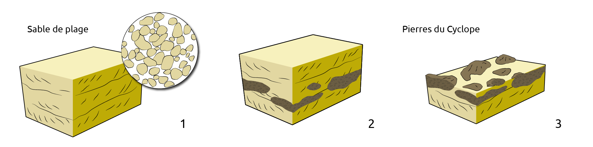 Le grès d’Aix-la-Chapelle s’est formé par la solidification de différents composants présents dans le sable. Ces processus ont eu lieu durant le pliocène il y a 5 à 2,5 millions d’années. La disparition ultérieure des couches de sable qui se trouvaient au-dessus ont ensuite mis au jour les pierres du Cyclope.