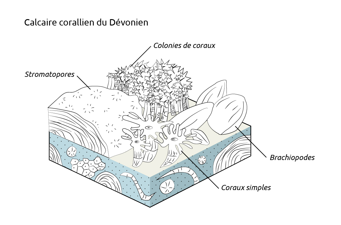 Dans l’Euregio, la roche calcaire est apparue bien plus tôt dans l’histoire de la Terre. L’apparition de ces roches remonte à l'ère primaire (paléozoïque), il y a plus de 300 millions d’années. À cette époque, la région de l’Euregio était largement couverte d’une mer tropicale chaude, dans laquelle se formèrent des récifs calcaires à partir de différents coraux pourvus de squelettes calcaires, mais également de coquilles.
