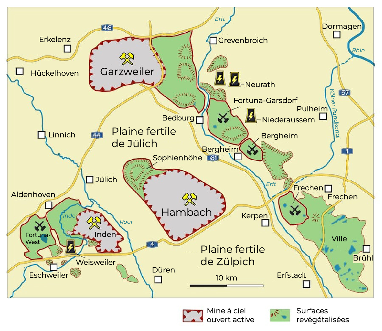 L’image montre le bassin minier de lignite rhénan. Lors de la revégétalisation d’une surface (voir légende), il s’agit de restaurer des milieux de vie qui ont été détruits par d’importantes interventions à la suite d’activités économiques.