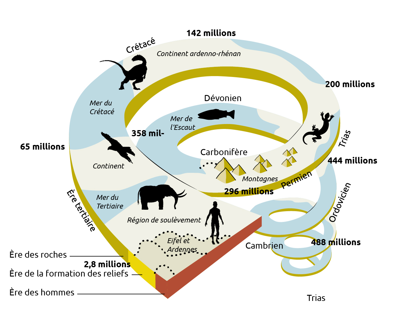 L’évolution de l’Euregio Meuse-Rhin peut être retracée depuis le paléozoïque grâce aux roches que l’on y trouve aujourd’hui. À cette époque, l’Euregio Meuse-Rhin se trouvait encore au niveau de la latitude 70° de l'hémisphère sud. Au cours de millions d’années, l’Euregio Meuse-Rhin s’est déplacée jusqu’à sa position actuelle à une latitude de 50° nord. Lors de ce voyage, l’Euregio Meuse-Rhin a traversé différentes zones climatiques. La région a plusieurs fois été recouverte d’eau.