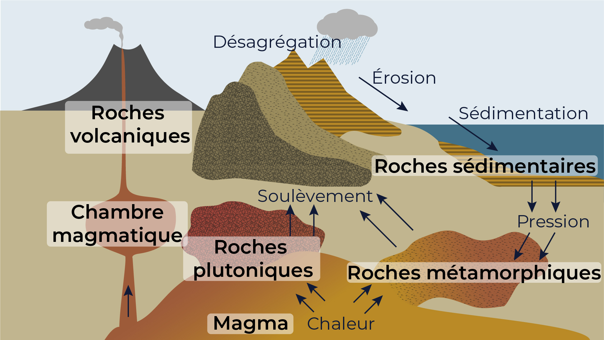 La première partie du chapitre a pour but de faire comprendre aux élèves que les paysages apparaissent et disparaissent comme tout le reste, même si cela n’est pas perceptible à l’échelle d’une vie humaine. Le cycle géologique permet ici d’acquérir des connaissances techniques de base.