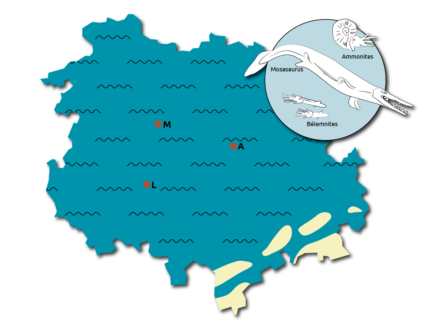 Répartition entre la terre et la mer durant le cambrien (541 – 488 millions d’années) dans l’Euregio Meuse-Rhin. Les points rouges indiquent la position des villes actuelles de Maastricht (M), Liège (L) et Aix-la-Chapelle (A).