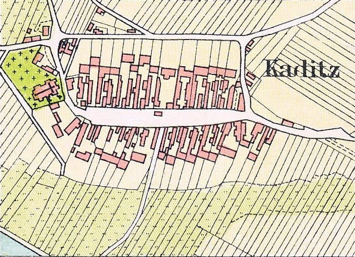 Eine Karte von Heerlen im Jahr 1822, im roten Rechteck liegt die St. Pancratiuskirche mit dem Dorfzentrum. Diese historische Karte ist um 90 Grad nach rechts gedreht. Norden liegt hier also rechts, Westen ist oben usw.