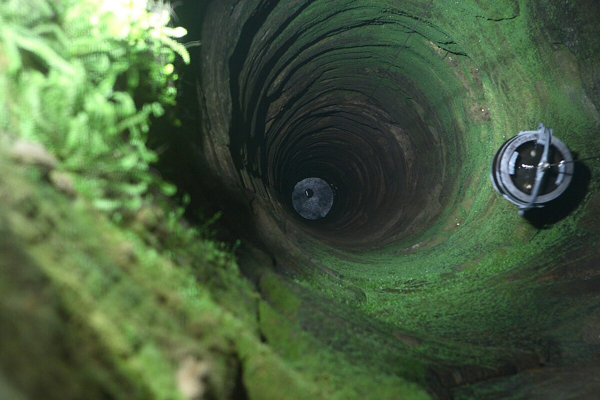 Grundwasser: Wasser, das sich unterhalb der ErdoberflĂ€che befindet. Traditionelle Brunnen, wie der hier gezeigte, sind einfach Löcher, die so tief in die ErdoberflĂ€che gegraben oder gebohrt werden, bis sie auf die Grundwasserschicht stoĂen.