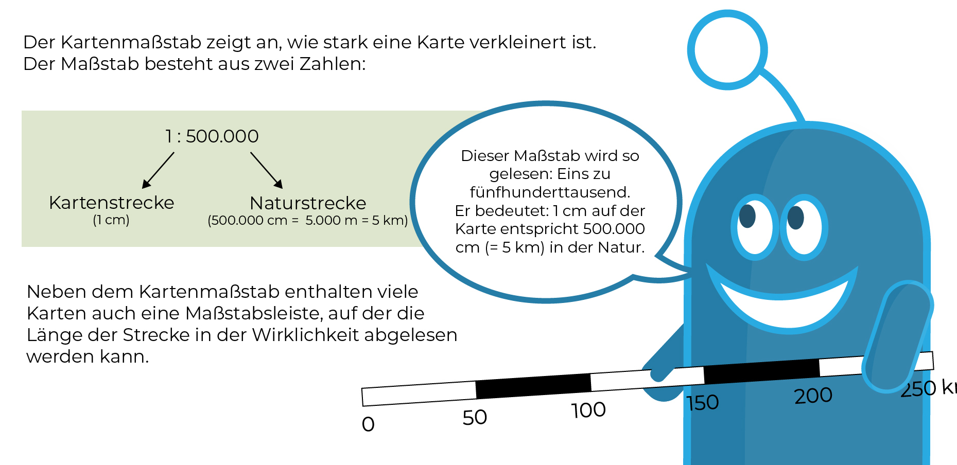 Das Kapitel beginnt mit den besonderen Merkmalen einer Karte (1. Vom Bild zur Karte) sowie einfachen Grundlagen zum Lesen einer Karte. Dazu gehören Ăbungen zum Umgang mit der Legende (2. Wie lese ich eine Karte) sowie dem MaĂstab (3. Wie bestimme ich Entfernungen in Karten?).Â