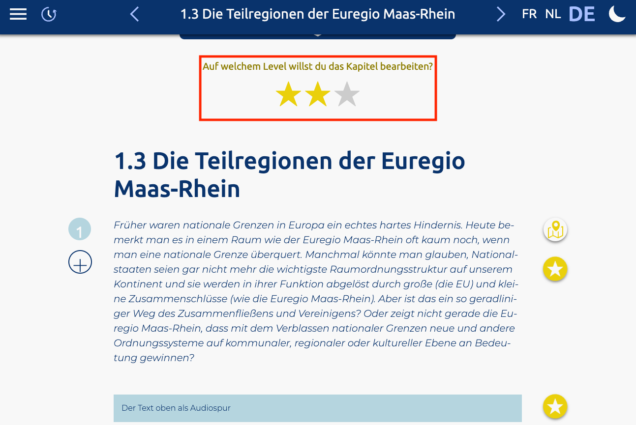 Der Anspruch ist dabei nicht, die vielen unterschiedlichen Lehrpläne und Philosophien der beteiligten Länder bis hin zu den mannigfaltigen Schularten und Leistungsniveaus umfassend abzubilden. Gleichzeitig sollen möglichst viele Lernende und Lehrende in der Euregio Maas-Rhein von diesem außergewöhnlichen Material profitieren. Deshalb ist das Material an vielen Stellen bis zu dreifach differenziert, einzustellen über den Sternmodus.