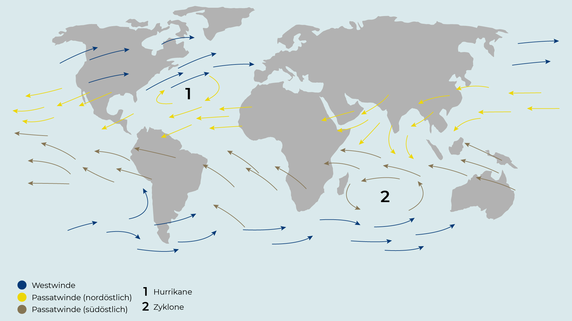 Die Karte zeigt über die Pfeile die aktuelle Windrichtung und -stärke an (je dunkler der Pfeil, desto schwächer der Wind). Die Farbe des Untergrunds zeigt die jährliche Niederschlagsmenge an (je heller, desto mehr). Wenn du auf die Legenden-Kachel (unter dem Texteingabefenster oben links) klickst, bekommst du eine genauere Erklärung zur Farbbedeutung.