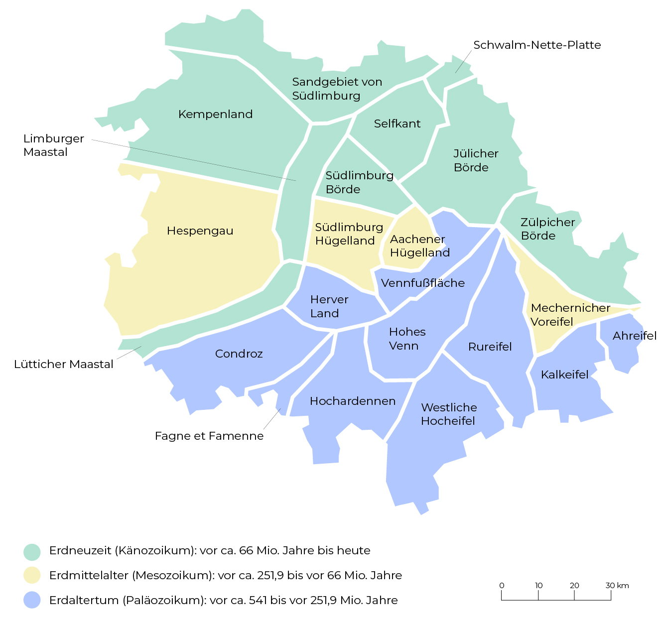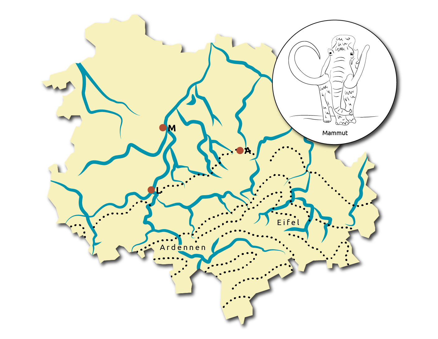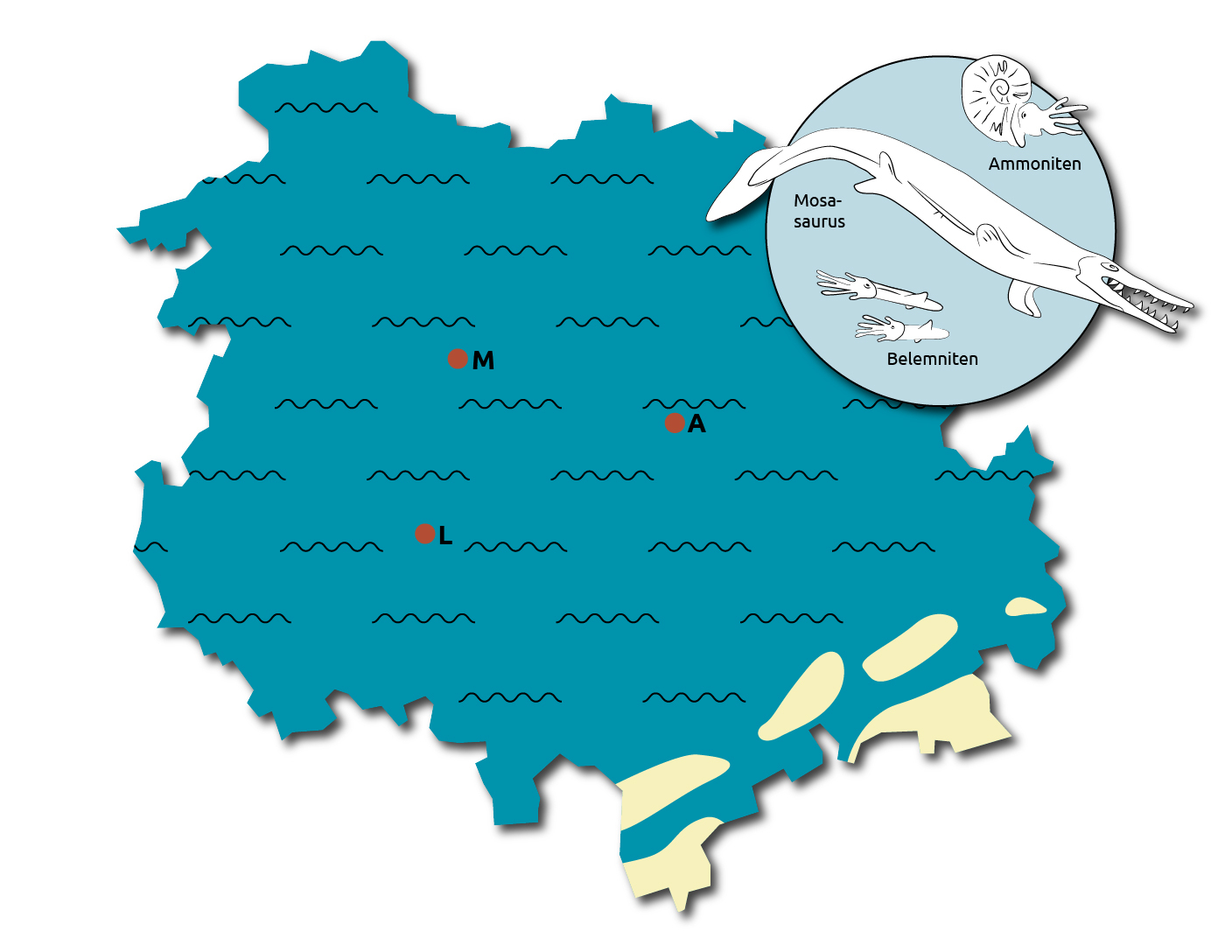 Land-Meerverteilung während der Oberkreide-Zeit (zwischen vor 85 und vor 65 Millionen Jahre) in der Euregio Maas-Rhein (zu dieser Zeit entstanden die Kalksandsteine der Region!)