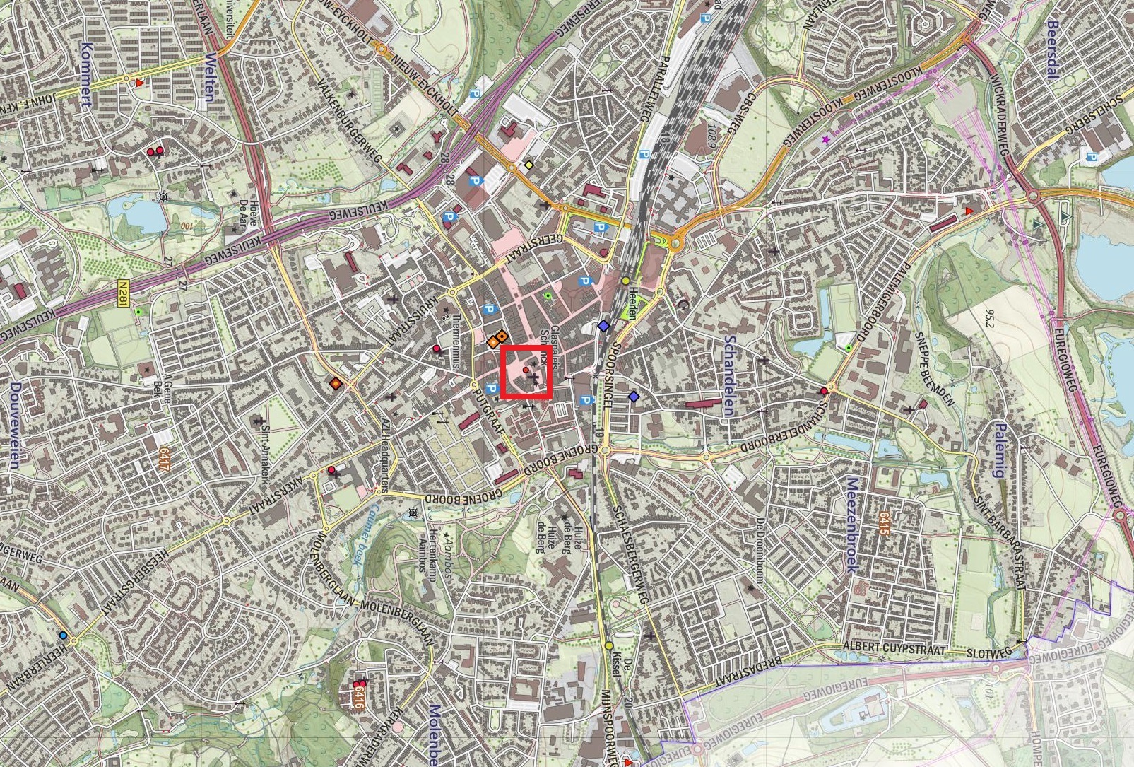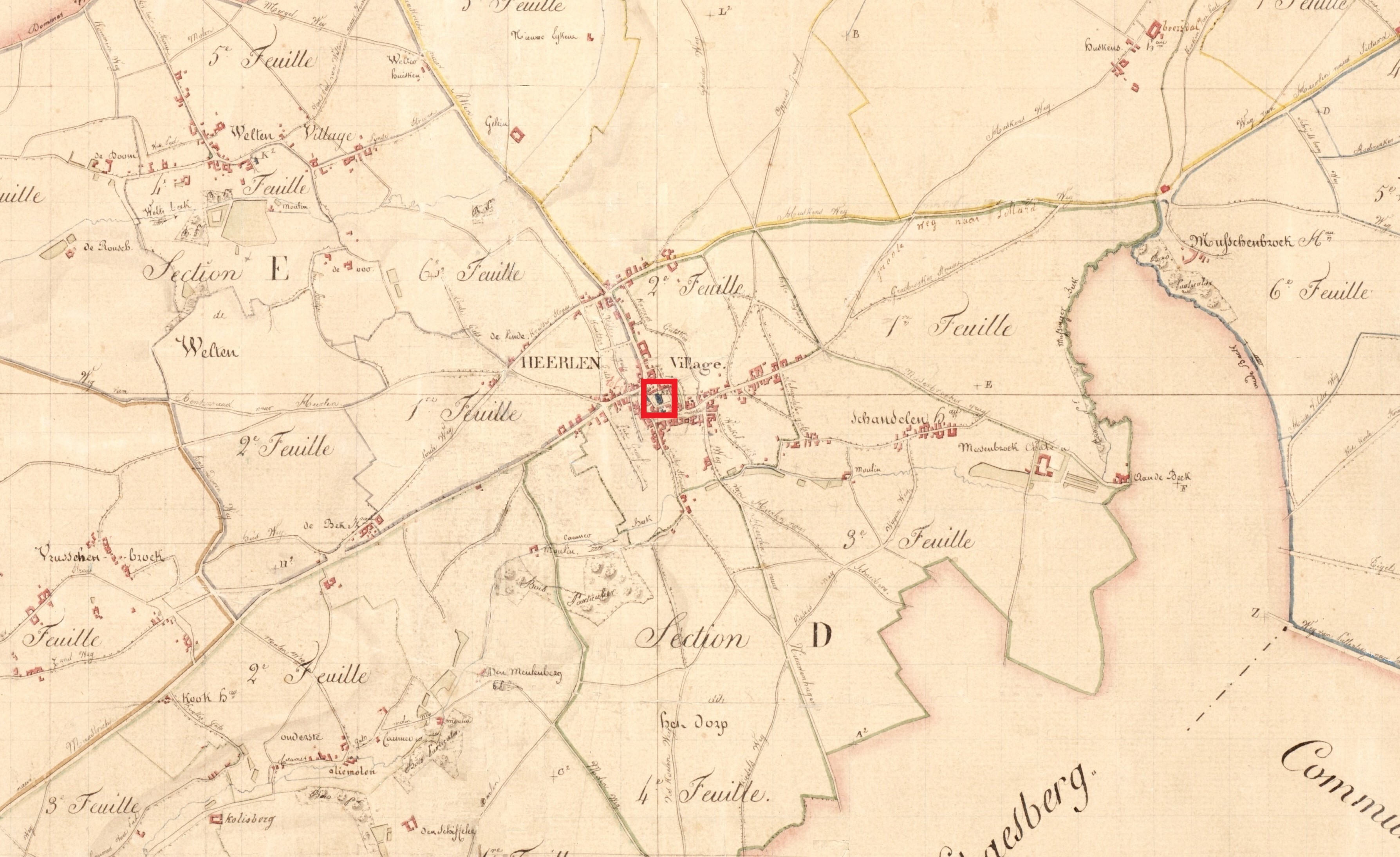 Eine Karte von Heerlen im Jahr 1822, im roten Rechteck liegt die St. Pancratiuskirche mit dem Dorfzentrum. Diese historische Karte ist um 90 Grad nach rechts gedreht. Norden liegt hier also rechts, Westen ist oben usw.