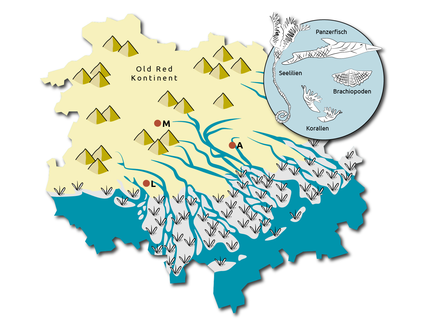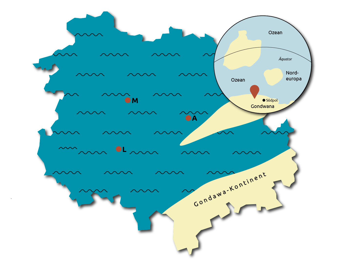 Land-Meerverteilung während der Kambrium-Zeit (vor 541–488 Millionen Jahre) in der Euregio Maas-Rhein. Die roten Punkte markieren die Lage der heutigen Städte Maastricht (M), Lüttich (L) und Aachen (A).