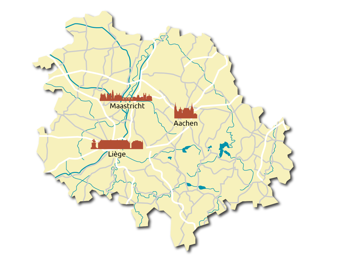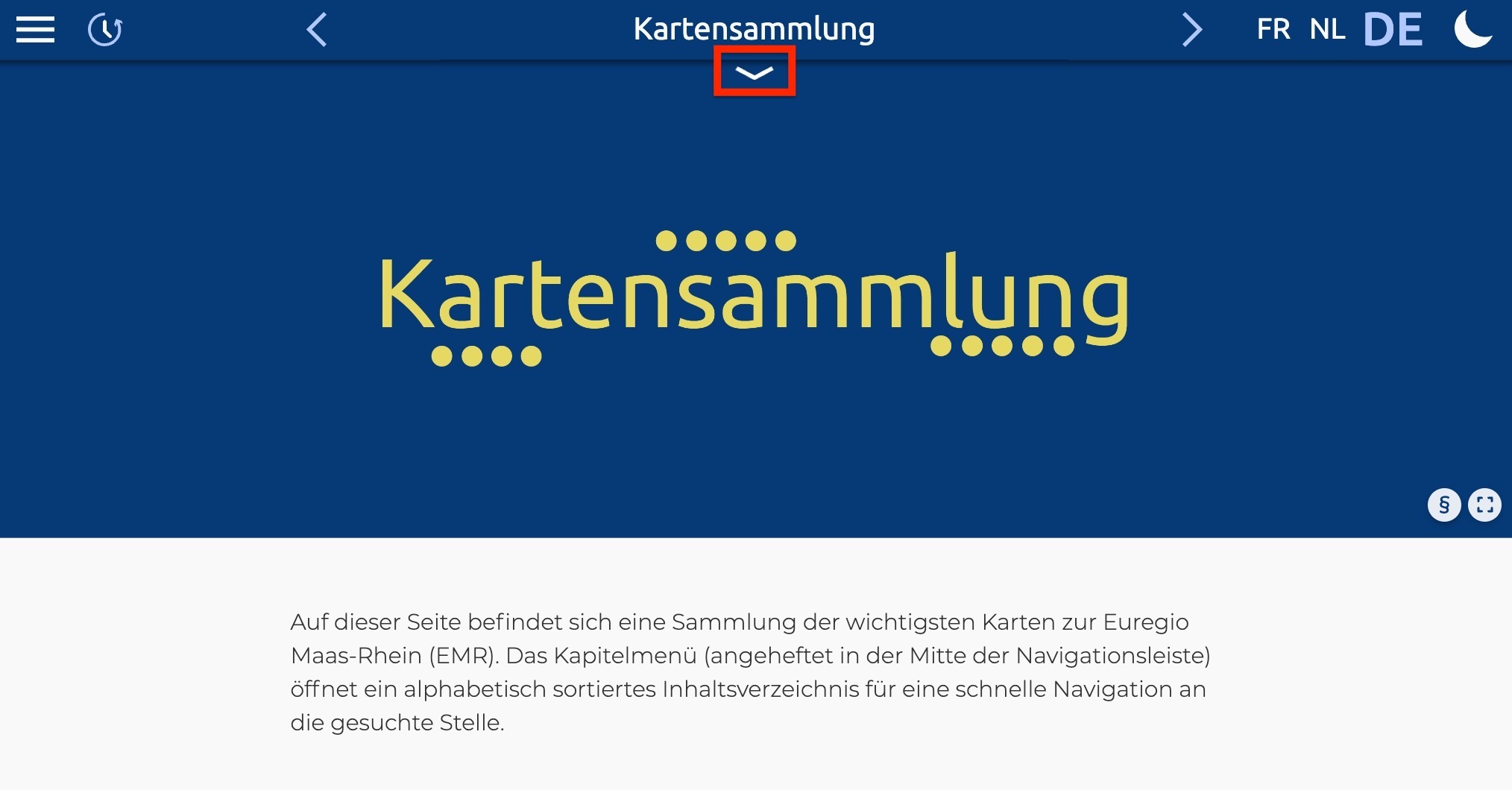 Auf dieser Seite befindet sich eine Sammlung der wichtigsten Karten zur Euregio Maas-Rhein (EMR). Das Kapitelmenü (angeheftet in der Mitte der Navigationsleiste) öffnet ein alphabetisch sortiertes Inhaltsverzeichnis für eine schnelle Navigation an die gesuchte Stelle.