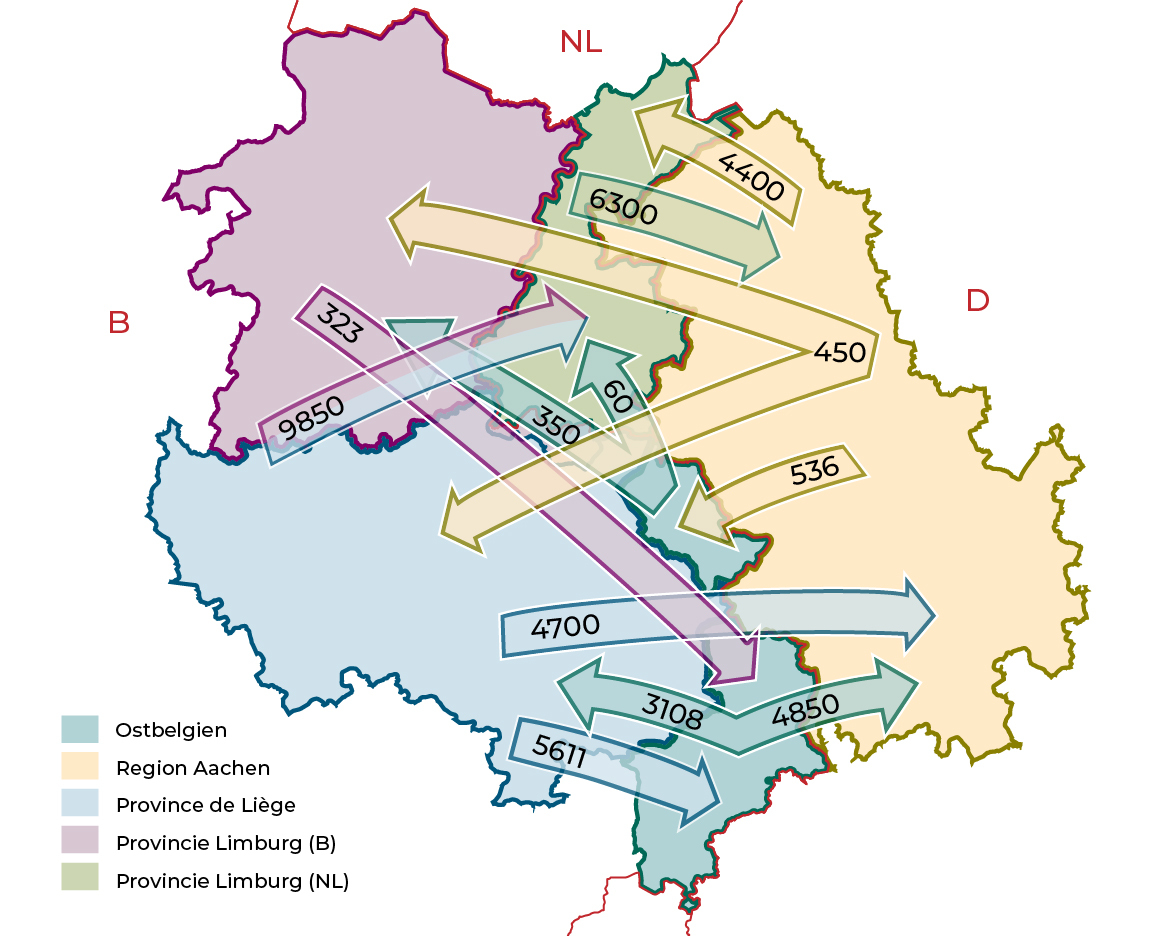 Auf dieser Karte (3.2 E27) kannst du erkennen, wie viele Menschen in der Euregio Maas-Rhein von Region zu Region pendeln. Wie du diese Karte richtig auswertest, erfährst du in Kapitel 6.1.
