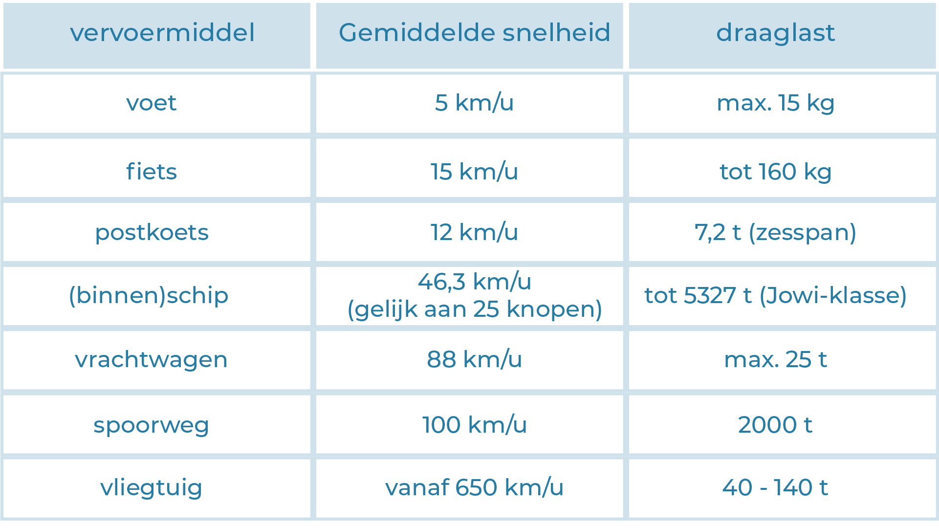1. Stel dat een bedrijf 5.000 ton goederen wil vervoeren over een afstand van 1.000 km. Zoek met behulp van de onderstaande tabel uit wat de geschikte vervoermiddelen zijn.