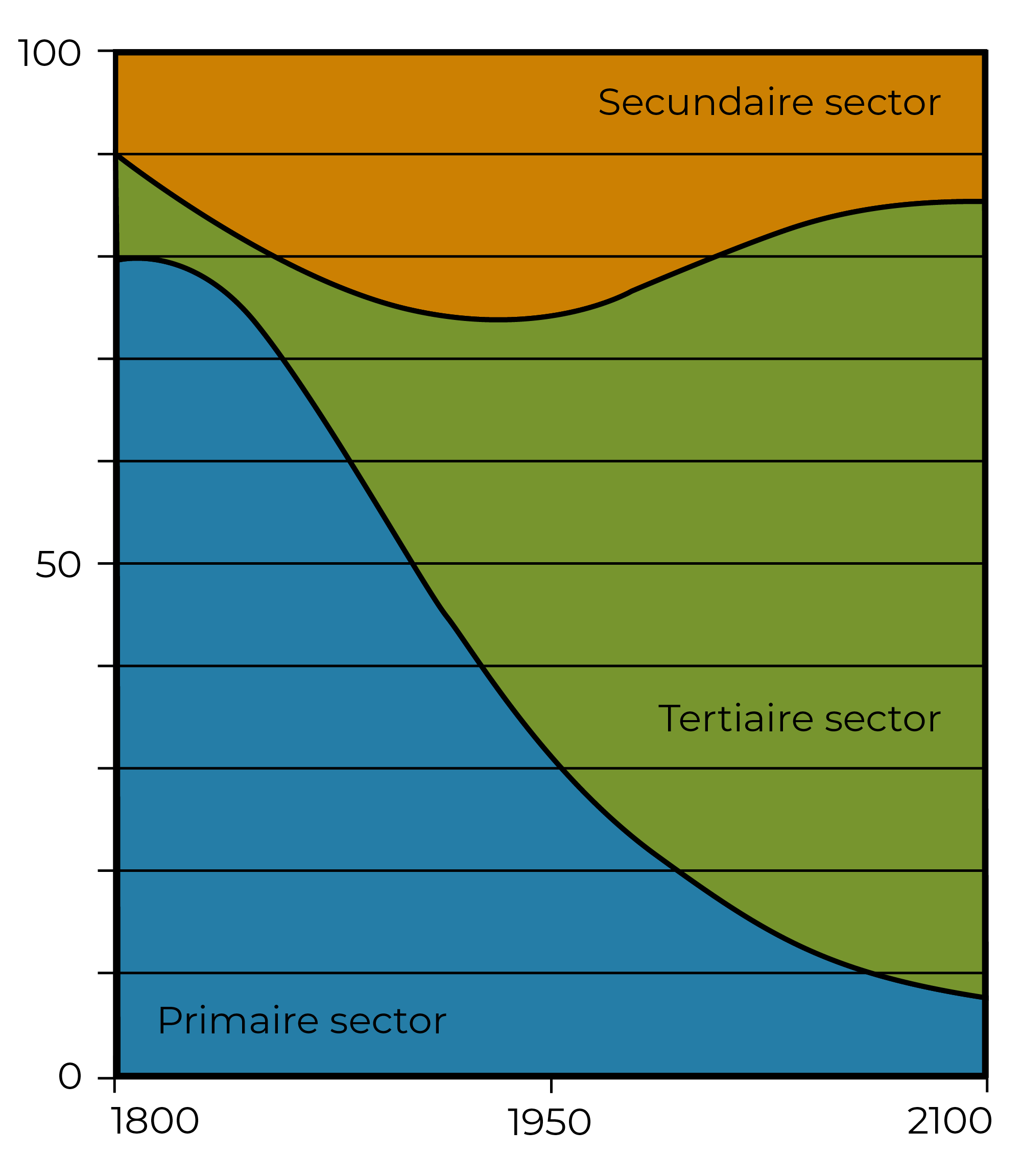 Het model van Fourastié laat zien dat de aandelen van de economische sectoren sinds 1800 sterk zijn veranderd.