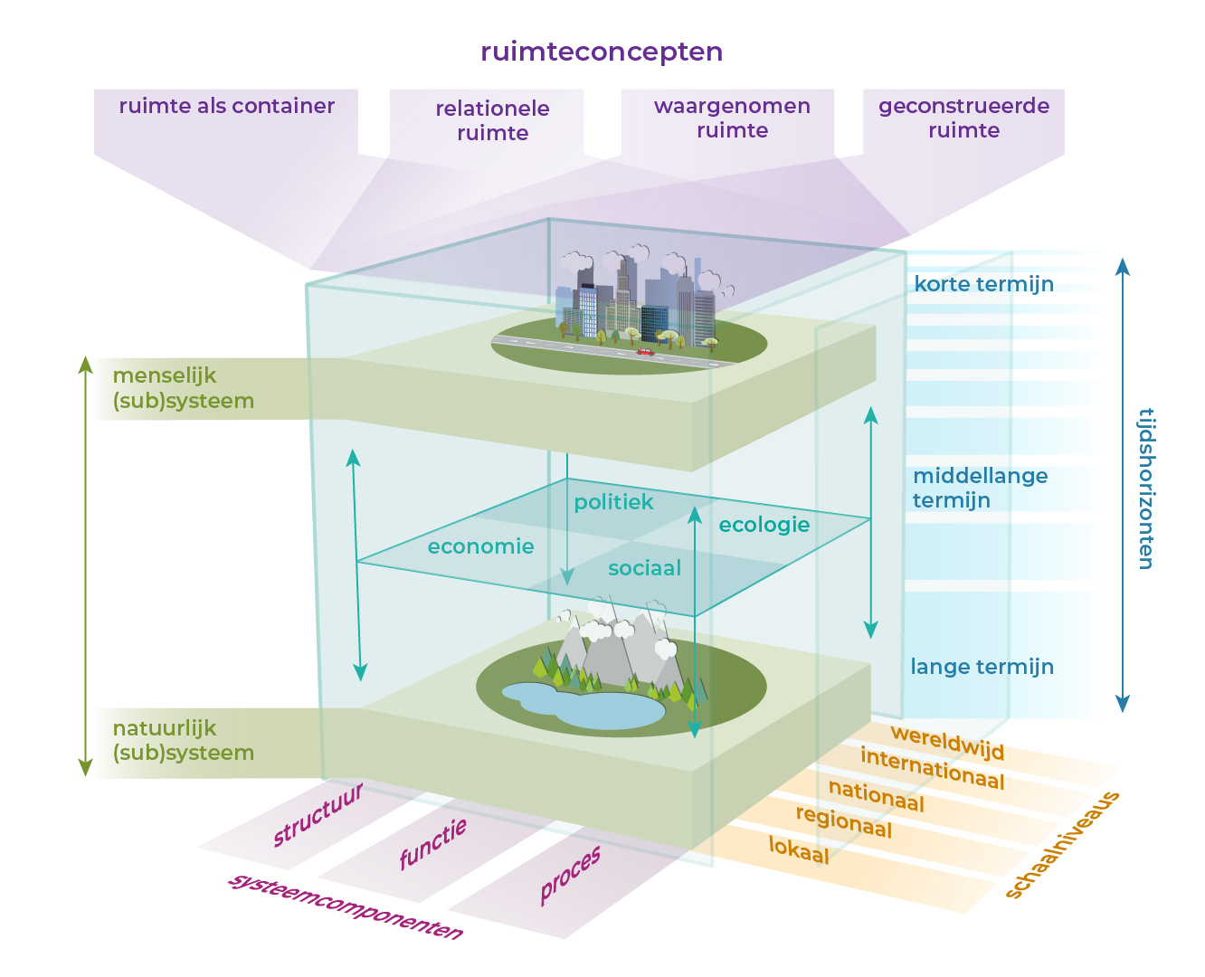 Vooral tegen de achtergrond van de klimaatverandering wordt duidelijk dat de energievoorziening op verschillende schaalniveaus moet worden bekeken. Terwijl de winning van bruinkool een regionaal verschijnsel is, heeft het gebruik van kernenergie op zijn minst nationale en internationale implicaties. De gevolgen van de klimaatverandering worden wereldwijd gevoeld. Terwijl de voorraden deel uitmaken van het natuurlijke subsysteem, heeft de voorziening en het gebruik van energie een duidelijk zwaartepunt in het menselijke subsysteem. De functie en het proces van de systeemcomponenten worden op een speciale manier behandeld. In de discussie over energievoorziening komen alle dimensies van de duurzaamheidsvierhoek aan de orde, zoals de wens van betaalbare energie (economie/sociaal), de toekomst van de werknemers in de bruinkoolwinning (sociaal), de verandering van het landschap door de bruinkoolwinning en de klimaatcrisis (ecologie) evenals de politieke discussie over het potentieel gevaar van kernenergie (politiek). In de meeste gevallen wordt de ruimte als een container gezien. Als het gaat om het gehercultiveerde landschap van de dagbouw, wordt ruimte ook opgevat als een construct.