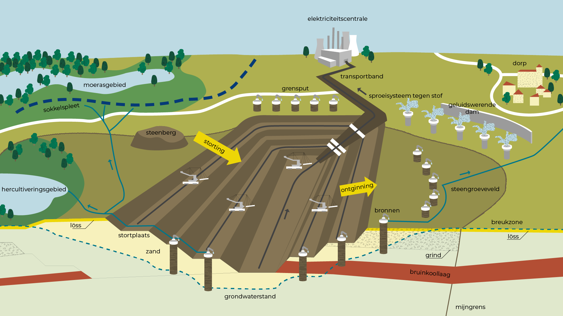 Het schema toont een overzicht van alle aspecten van de bruinkoolwinning die in het 360°-beeld te vinden zijn.