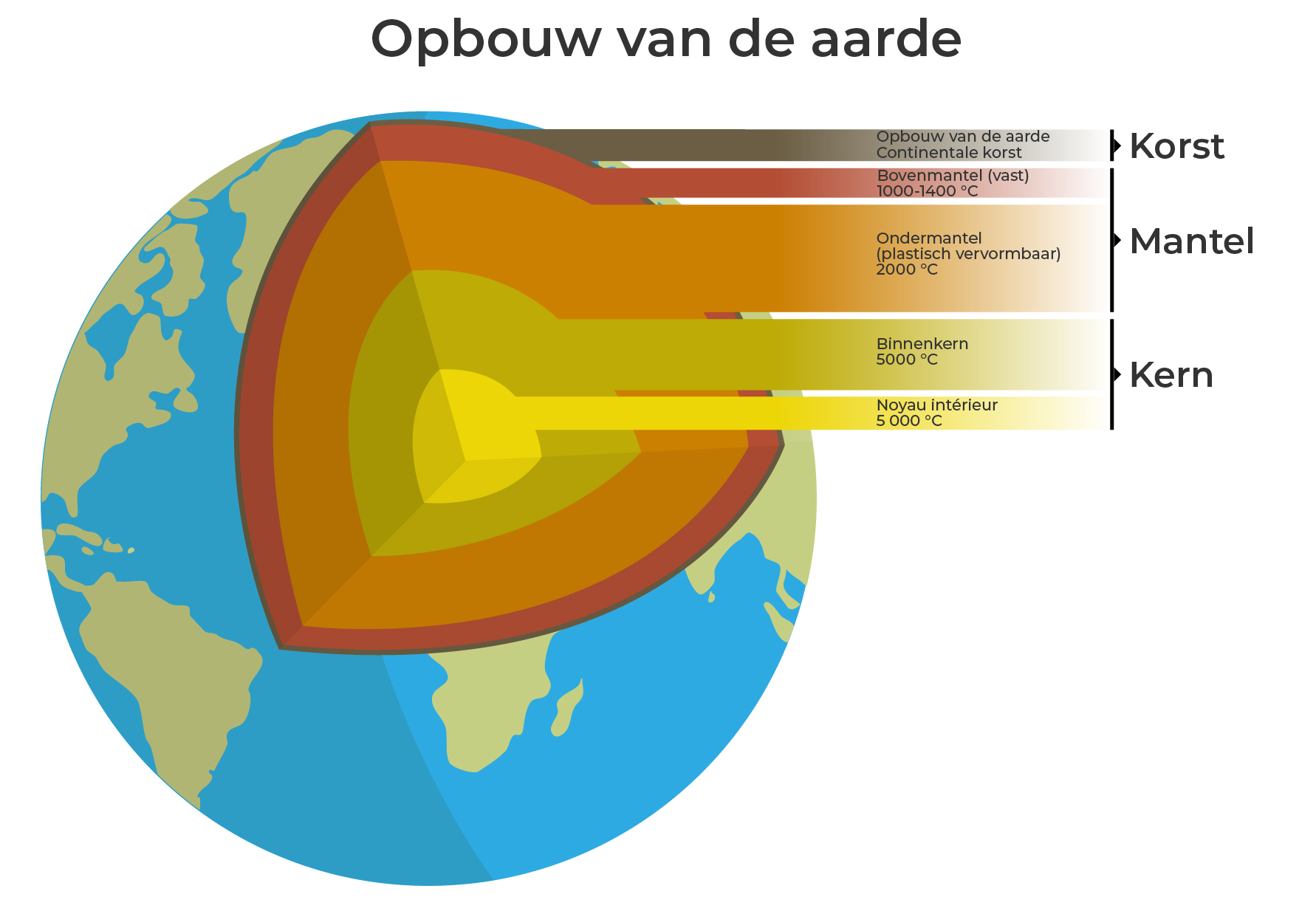 3/3: Grafiek: Opbouw van de aarde. De verschillende aardlagen zijn weergegeven in rood-oranje-gele tinten, wat de verschillende warmteniveaus duidelijk moet maken. Daarnaast wordt aan de rechterrand van de figuur de uitleg in het kort weergegeven. De bron vind je rechtsonder.