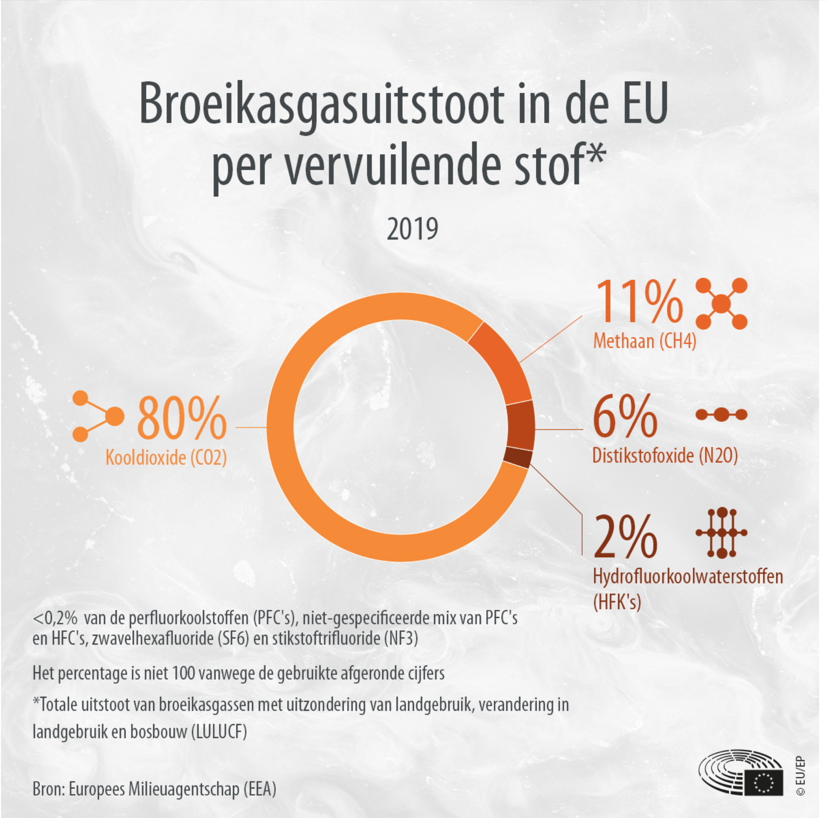 2/3: Hier is een cirkeldiagram met de vervuilende stoffen in procenten. Naast het cirkeldiagram zijn er pictogrammen die de inhoud duidelijk uitleggen. Daarnaast is er een verklarende tekst in het onderste deel van de figuur en een vermelding van de bron, waar de gegevens dus vandaan komen.